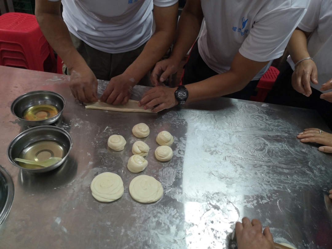在团体赛中,残疾人学员团结合作,有的和面,有的擀面,有的刷油,有的捏形状,有条不紊的进行着每个步骤,相互配合,彼此成全,很快完成了千层饼的制作,纷纷获得评委老师的认可赞扬。